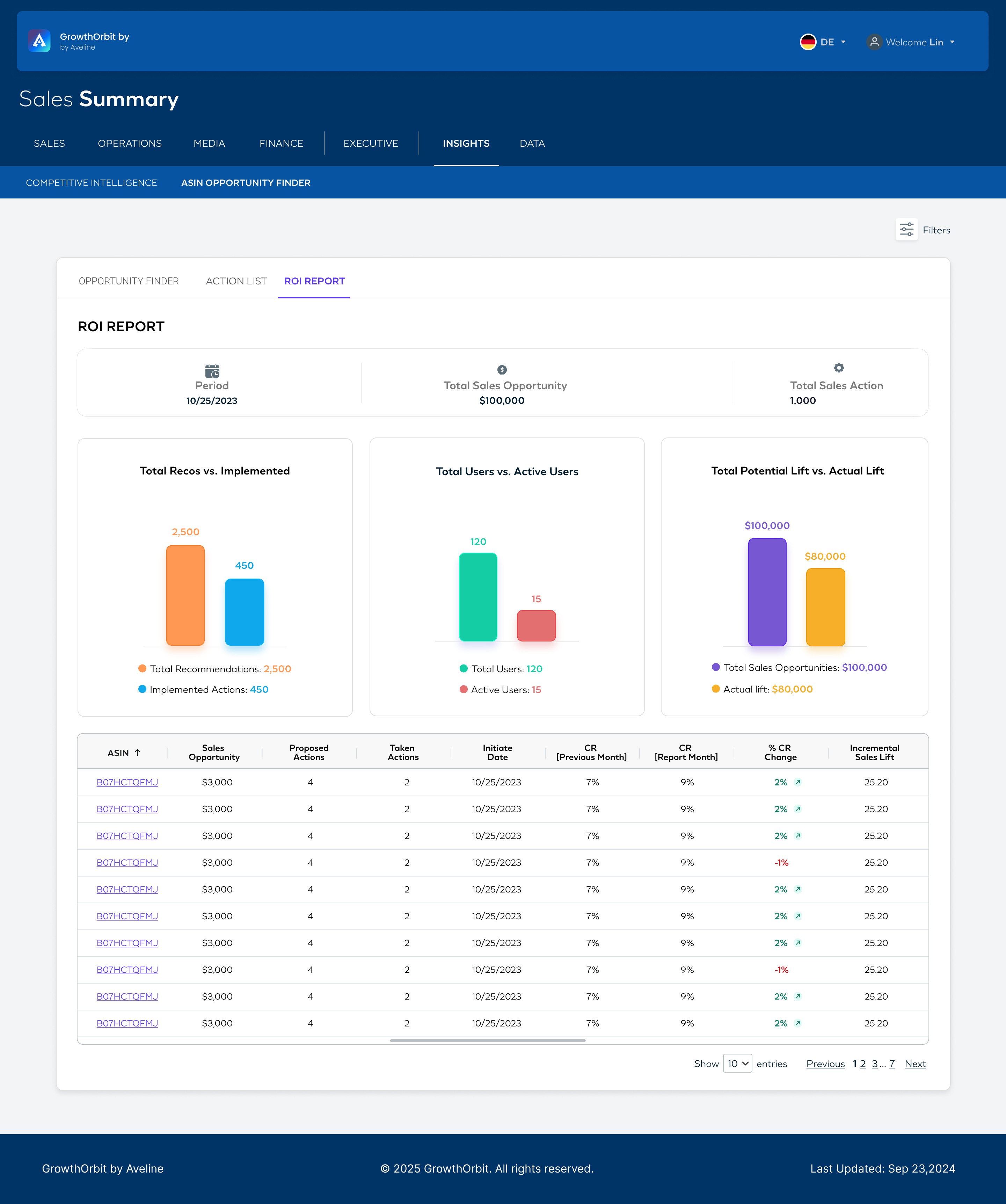 Used donut charts for actions vs implemented, users vs active, potential vs actual lift.