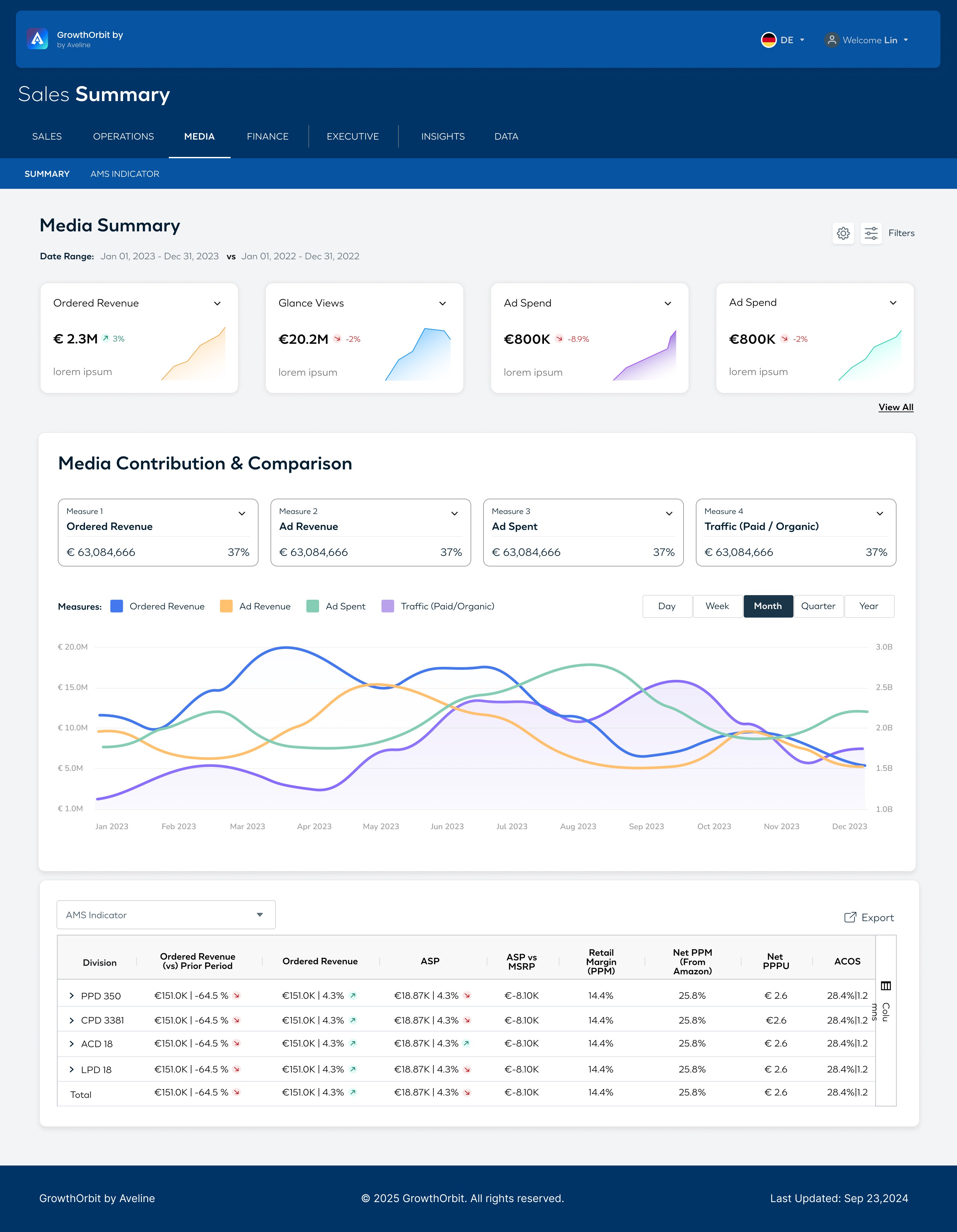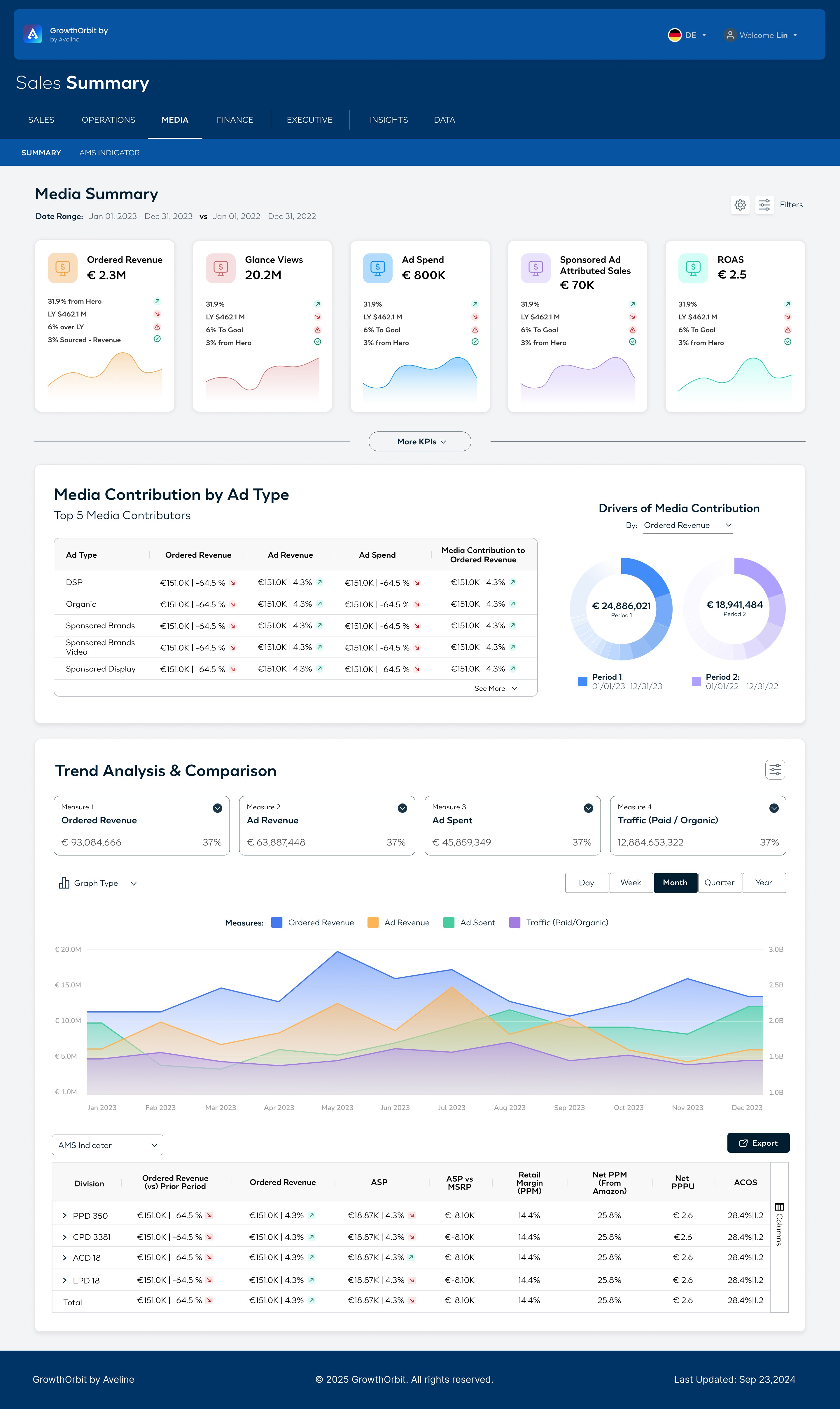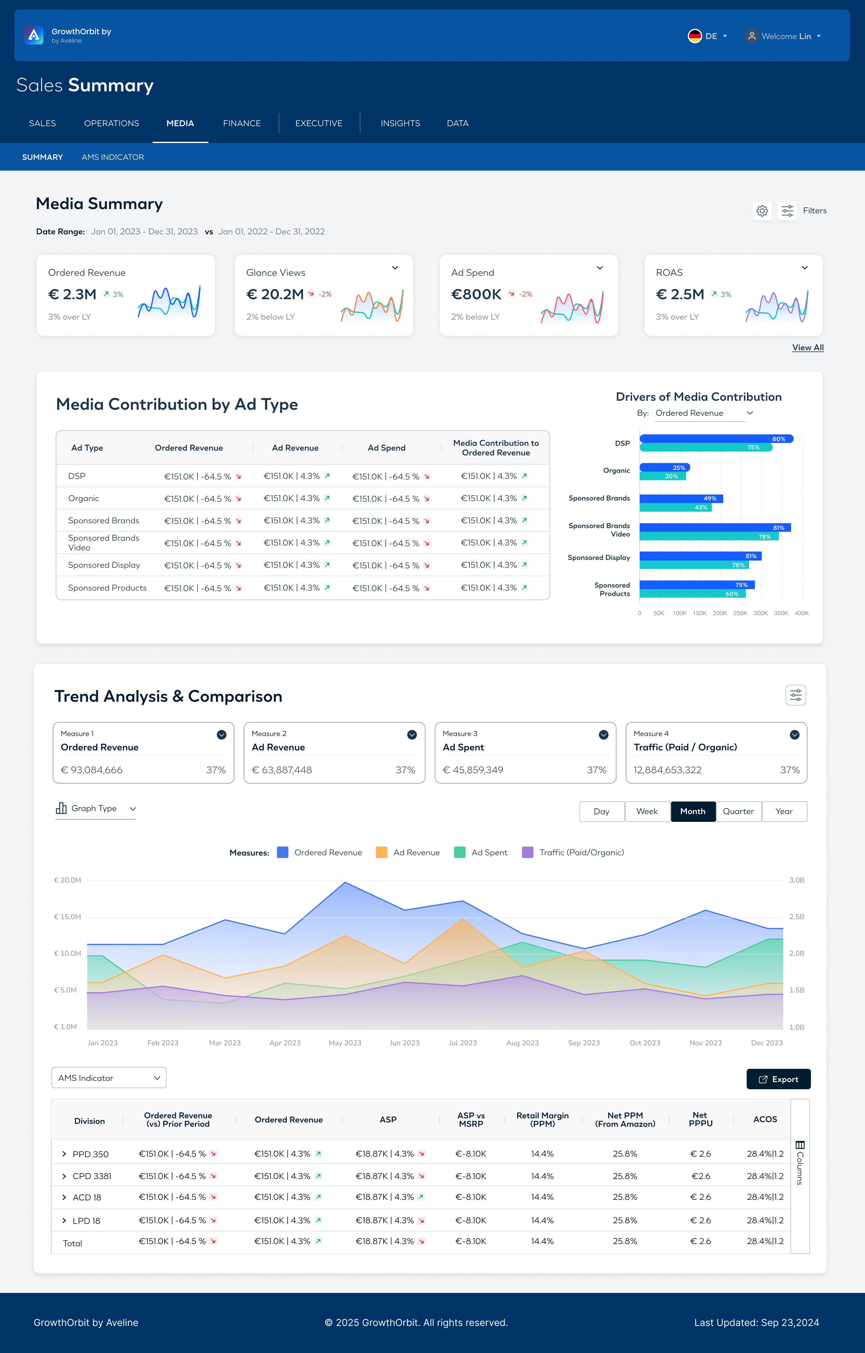 Redesigned Media Summary & ROI dashboards for clarity and actionability.