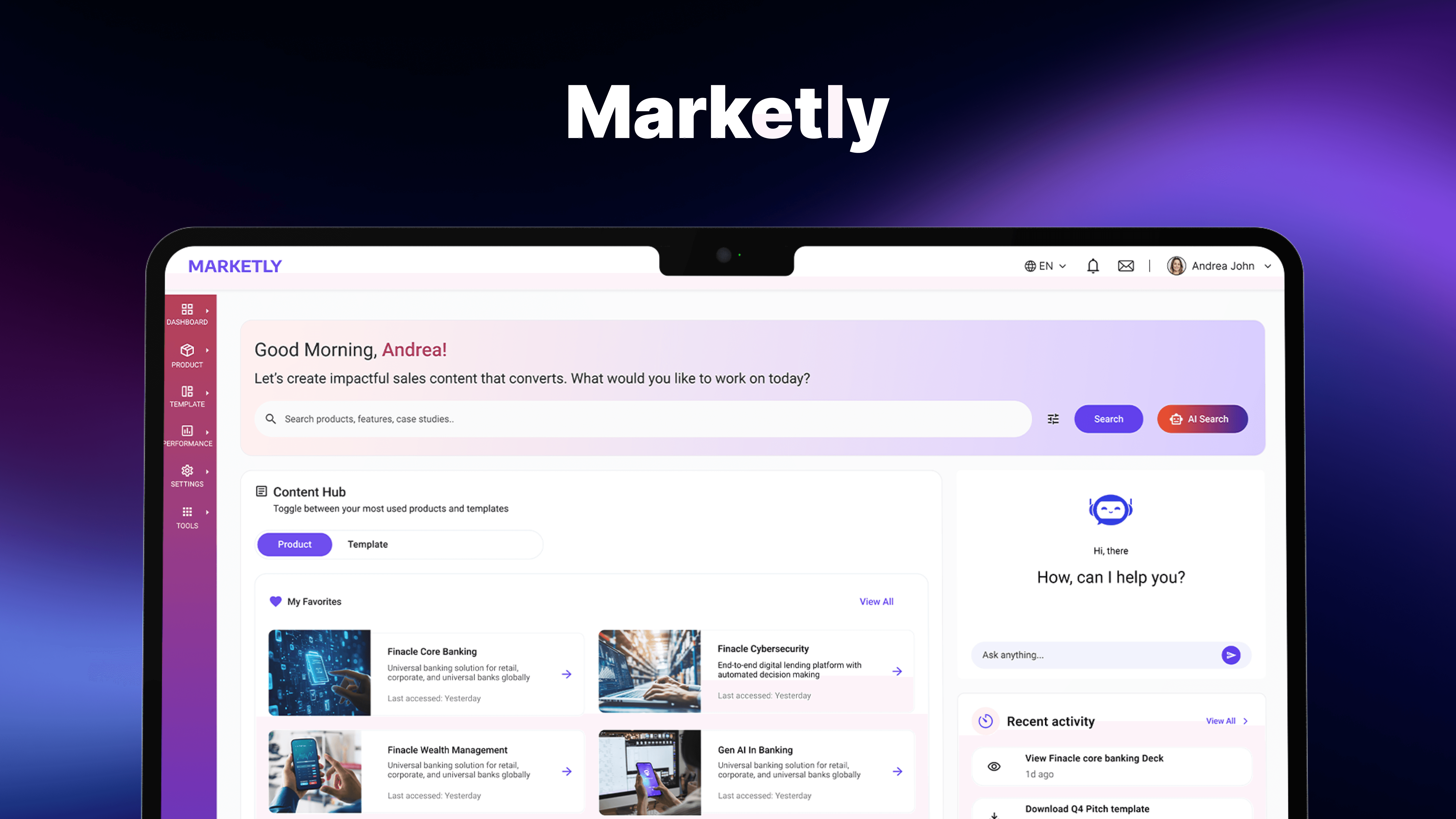 A representational presales marketing portal bringing everything in one place - dashboard, templates, products, content hub, and insights. Designed to help teams discover, share, and track impactful sales assets with ease.